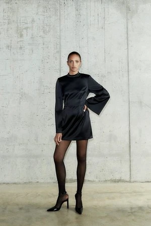 Bernalda is back in a shiny fabric this season with its short semi-fitted design and a beautiful collar-stand neckline, thin shoulder pads and flared full length sleeves with a zipper in left side seam for easy closure. It’s made in Stylein’s fine-textured and easily maintained crepe quality and goes perfect with a pair of knee-high boots in the evening.