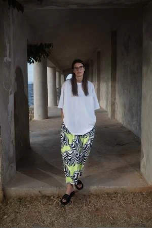 The Temper Pant in Diemta is a relaxed-fit pant. Front is flat, with an inverted pleat and back has elastic for a comfortable, easy fit. Crafted from breathable TENCEL, in custom artwork print Diemta.